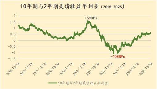 过去几年,美债市场最明显的趋势之一是交易员所说的“收益率曲线倒挂”。尤其是2022年7月开始到2024年8月的2年之间,10年期与2年期美债收益率长时间处于倒挂阶段,2023年7月3日更是创下倒挂108BPs的纪录(下图)。在通常情况下,长期收益率高于短期收益率,是为了补偿投资者长期放贷的风险,尤其是在通胀对固息债券支付产生侵蚀性影响的情况下。2021年3月29日,10年期美债收益率高出2年期美债159BPs。